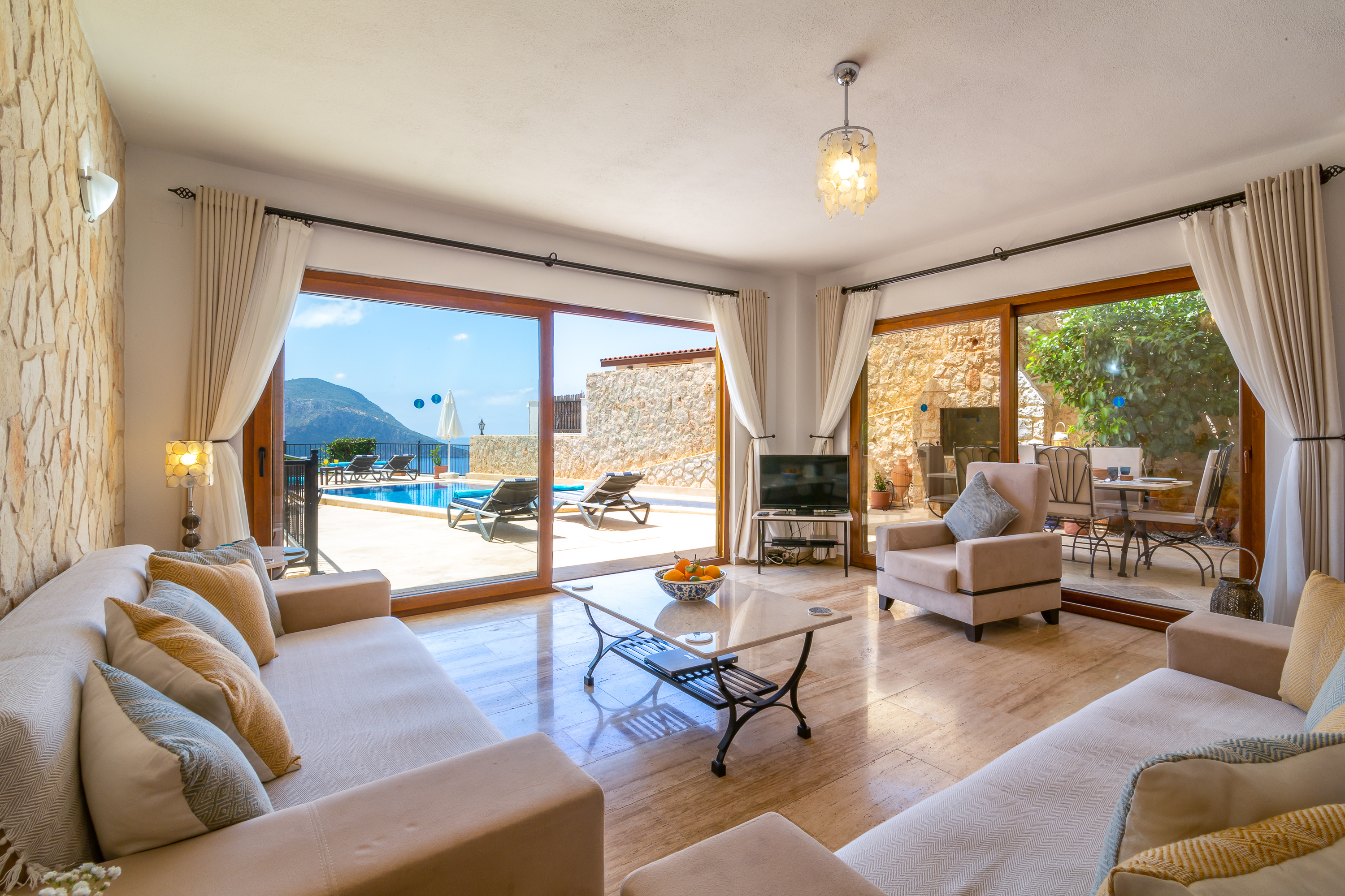 The light and airy indoor spaces are furnished to a high standard with cool marble flooring throughout and limestone feature walls, reflecting a modern Turkish interior style. The open plan living space provides comfortable seating for guests and the indoor dining area and well equipped kitchen enables "eating- in" to be a pleasure.