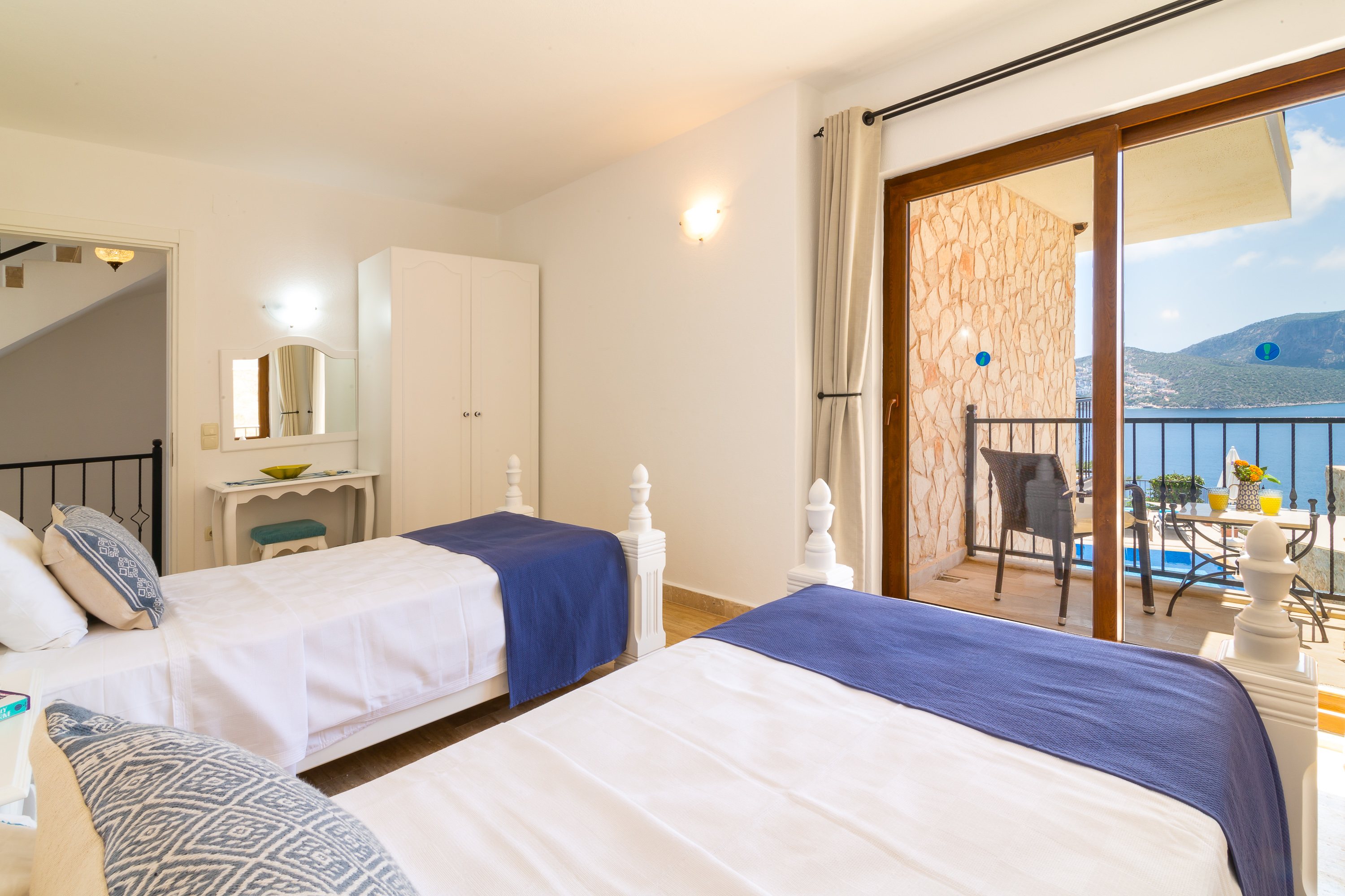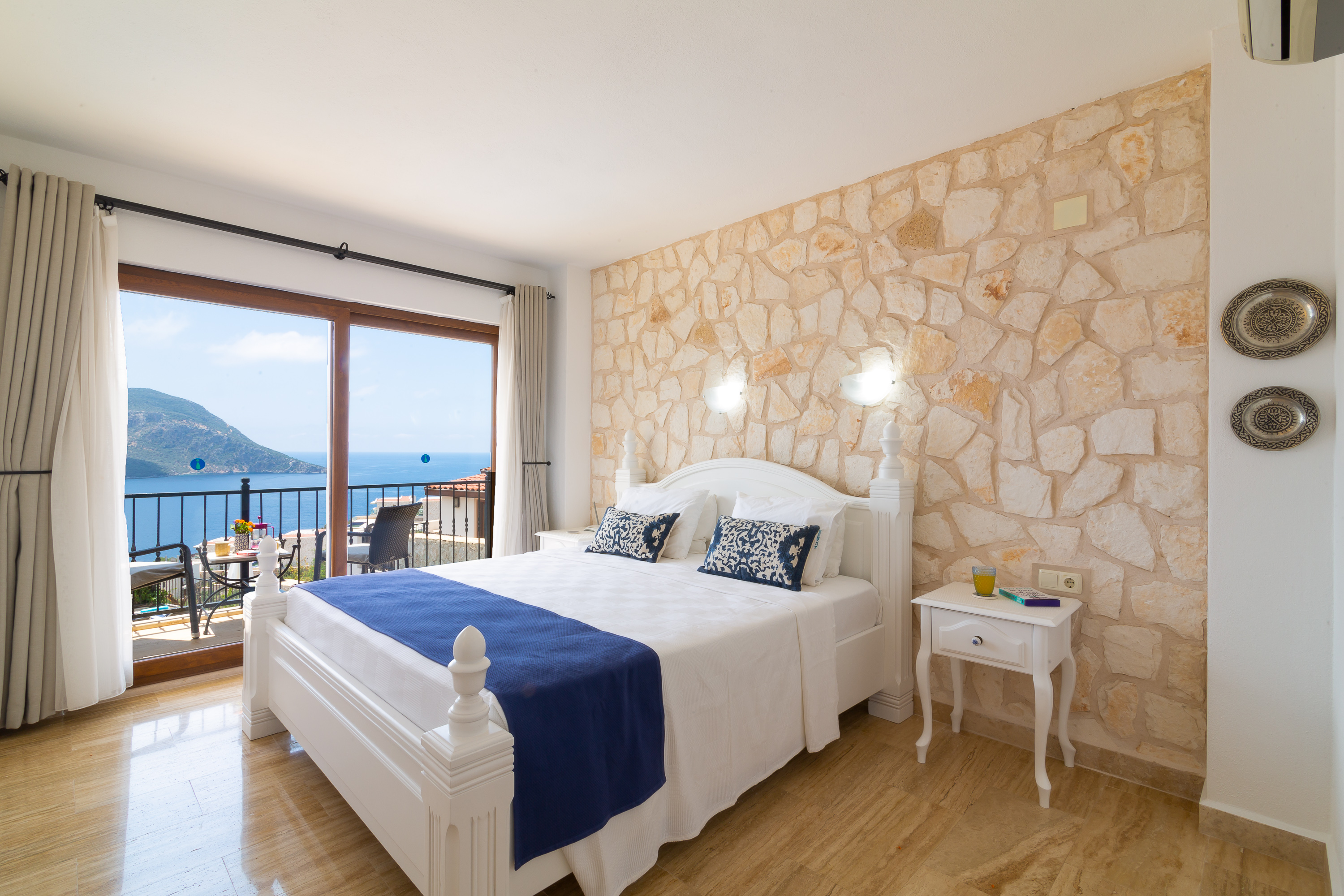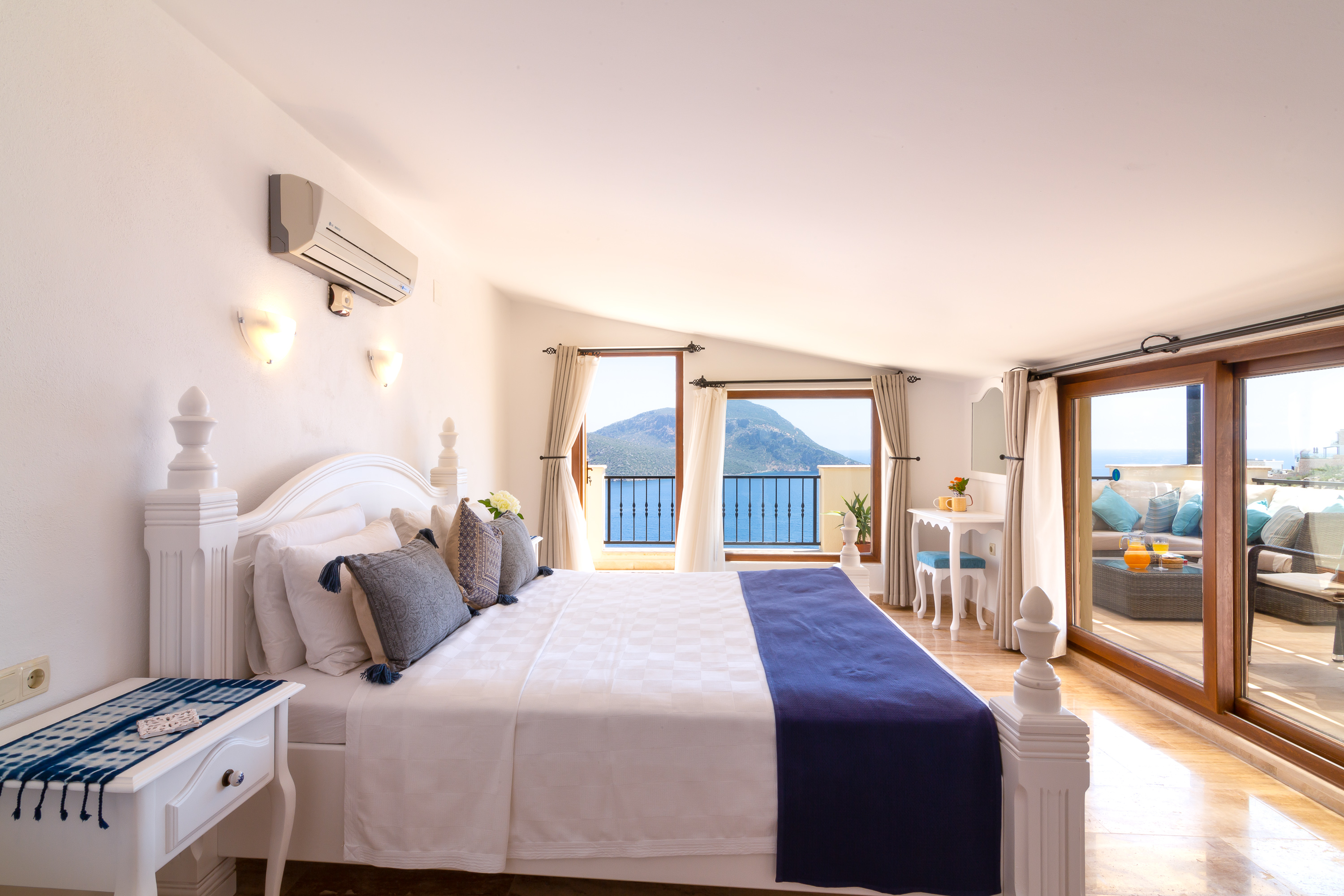 One king - sized bedroom which occupies the whole floor and very spacious en-suite shower room . The stunning roof terrace is accessed from this bedroom which comprises of a corner seating rattan suite comfortably accommodating 8 guests around beneath a shaded pergola, providing guests with panoramic views of Kalkan Bay. In addition an outdoor dining area and kitchenette complete with kettle, toaster and outdoor fridge enables breakfast to be taken al fresco with stunning sea views .