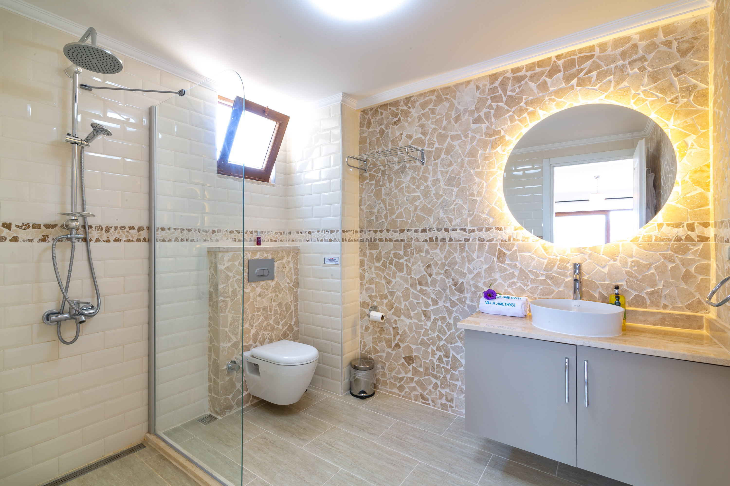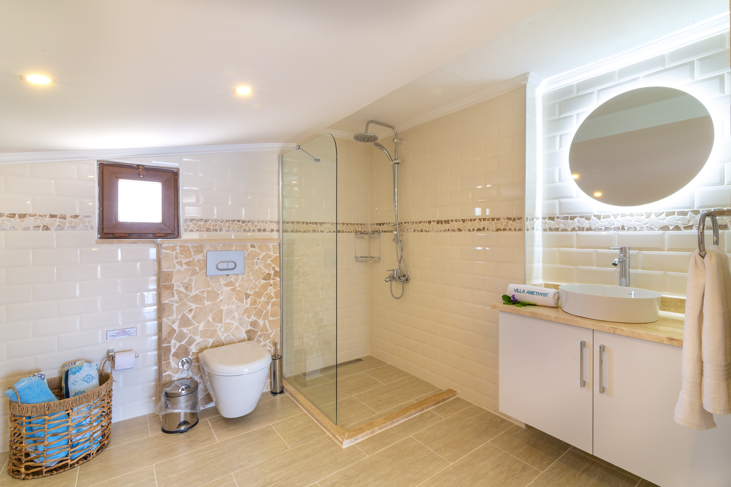 Steps lead down from the gated entrance, backed by a lovely Olive Grove, to a tree lined outside space with stunning turkish -stone shaded seating area , enclosed beneath a rustic pergola . An al-fresco shaded dining area seats 8 beneath a sail-type canopy and a stone BBQ provides ample opportunity for barbecue evenings with family and friends. Villa Amethyst has a stunning fresh-water pool accessed by graduated steps leading into the pool, depth being 1.3 m and at the far end of the pool being 1.5 m . The spacious pool terrace has 8 comfy sunbeds and ample parasols for guest use. Gated stairs lead down to the Villa's own private garage for private car-parking.